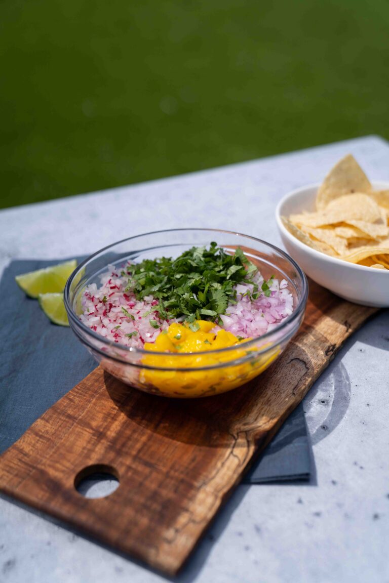 Are you looking for a unique and flavorful appetizer? If so, look no further than radish mango pico de gallo! This colorful and zesty dish is full of fresh ingredients like mangoes, radishes, red onions, cilantro, and lime juice. Not only is it a delicious way to start your meal off right by providing the perfect balance of sweetness and acidity; it’s also incredibly easy to make. In just 15 minutes or less, you can be enjoying this delightful treat with friends and family. So why not give this recipe a try today? It might just become your new go-to summer appetizer!